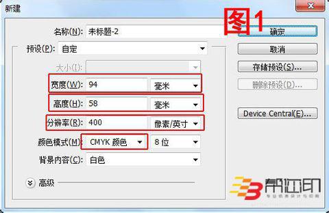 打開Photoshop,新建一個文檔,規格尺寸設置為寬度94MM,高度58MM,分辨率400,顏色模式CMYK,然后點擊確定。如圖1所示。