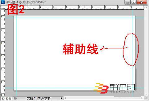 2、  在新建文檔中顯示標尺(視圖—標尺),然后拖拉輔助線,把出血用輔助線標示出來,如此,設計的時候才有一個清晰的設計范圍哦。如圖2所示。有時為了輔助線的準確性,可以放大圖像進行拖拉輔助線,相對會準確好多。
