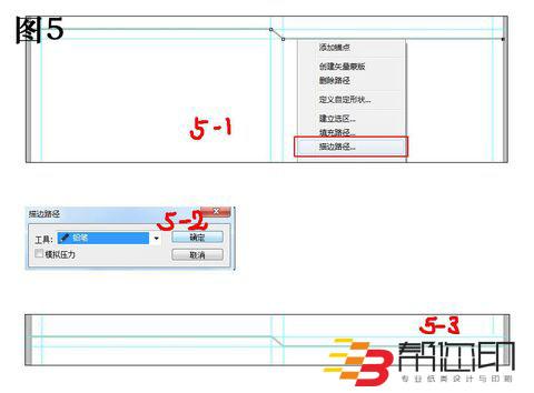5、 設置鉛筆筆觸的大小為5.然后用鋼筆工具畫出如圖5中(5-1)所示的路徑,然后右擊鋼筆工具選擇“描邊路徑”,在彈出的對話框中選擇“鉛筆”如圖(5-2),然后點擊確定,描邊路徑后的效果如圖(5-3)所示。