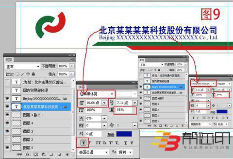 9、 然后在如圖9所示位置放上自己公司名稱,字體大小如圖中所示,或者根據自己公司名稱長短靈活設置字體大小、顏色、字符間距、英文名稱字體大小等等。